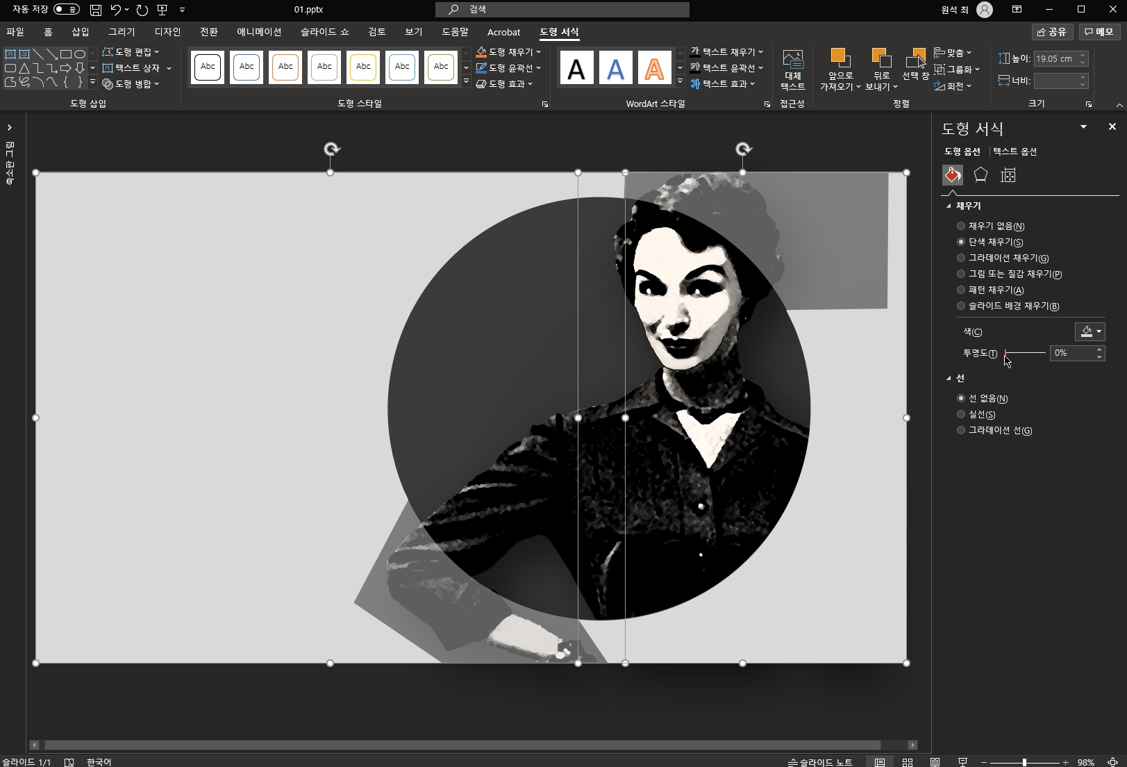 - 위 사진처럼 임시로 도형의 투명도를 살짝 투명하게 준 상태로 작업하시면 수월합니다