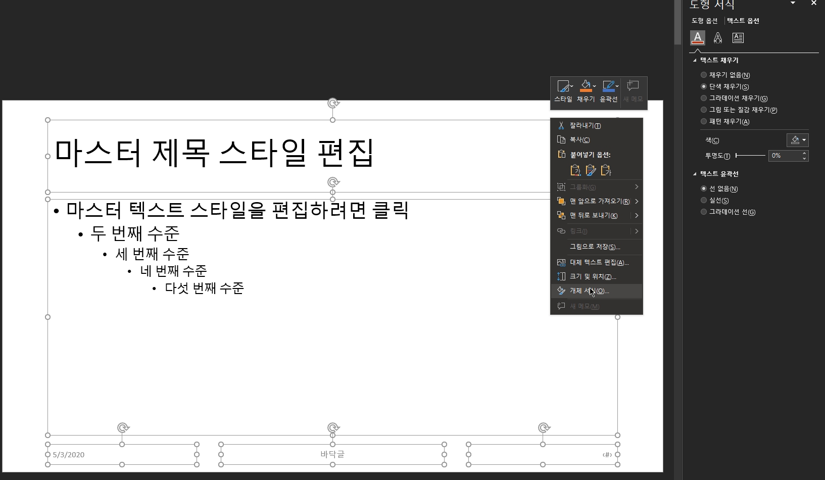 3. [Ctrl + A] 를 눌러 전체선택 한 뒤, [마우스 우클릭- 개체 서식 -텍스트 옵션] 으로 이동합니다.