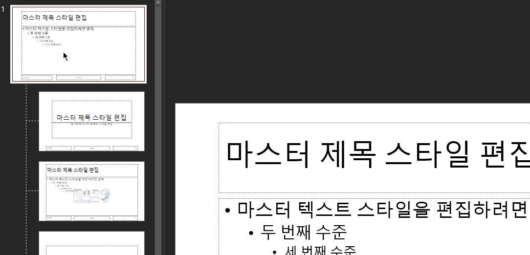 2. 많은 슬라이드가 보일텐데, 가장 위에 있는 마스터 슬라이드를 선택합니다.
