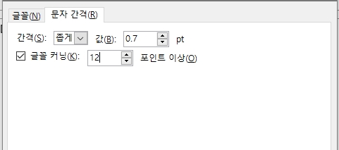 6. [문자 간격] - [좁게] - [0.6~0.7] 사이의 값으로 설정해줍니다.