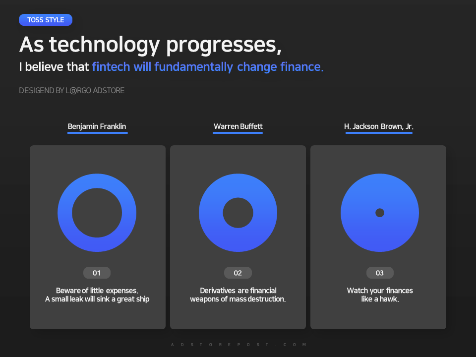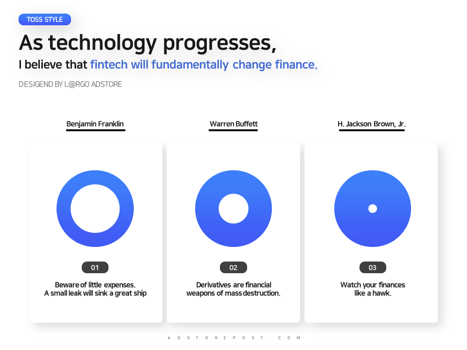 토스는 아주 깔끔한 배경 위에 텍스트와 간결한 브랜드컬러만을 활용하는 것이 특징이니