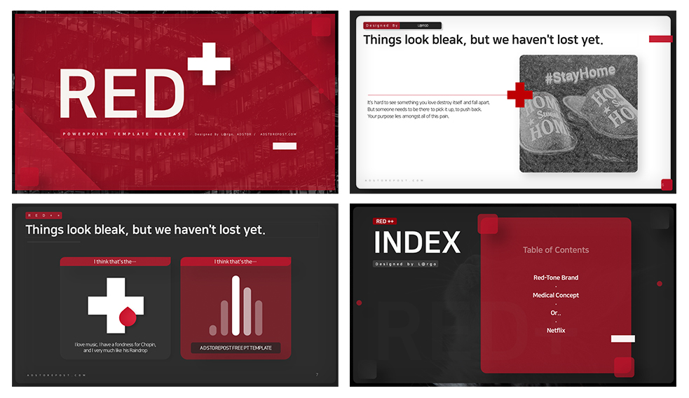 Red + 파워포인트 템플릿 배포 이번엔 특별한 시기다보니.. 관련 자료를만드실 분들이 계실 것 같아 만들어보았습니다 의료 컨셉과 넷플릭스 컨셉을 모두 아우르는 '붉은색'으로 제작해보았습니