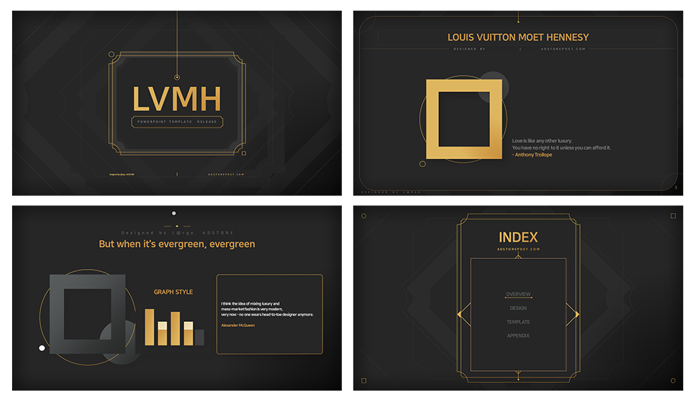 블랙 골드컬러를 사용한 패션컨셉 PT템플릿 : LVMH 저번에 업로드했던 LVMH 버전의 블랙버전으로 베리에이션 해보았습니다.화이트 버전에 비해 조금더 묵직하고 고급스러운 느낌이 연출됩니다. 흰